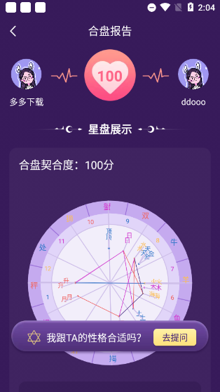 5、进入合盘报告即可简单明了的查看,你和朋友、伴侣的个人信息。