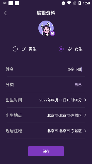 1、在使用之前,我们需要登录并且输入自己的生日等信息,然后点击保存。
