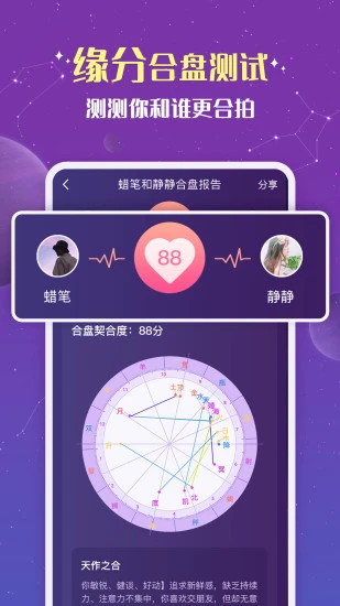 准准app是一个可以为用户带来最新星座运势信息的服务软件,在这里,用户可以查看自己的日常星座运势,查看幸运数字等,还可以关注朋友和爱人的多个星座运势,在线查看整体星座运势,询问生活中的所有重大事件和小情绪。软件支持用户进行运势的查询,各种星座故事也可以随时浏览,提升自己对星座知识的掌握,了解自身星座的起源更容易。并且系统还可以为你提供性别、爱情、血型等多角度的解读服务,为你预示未来和天赋,随时可以了解自己的幸运色以及好运指数情况,随时开启每日一测的操作。用户输入生日时间即可快速的计算您的准确星盘,并输出您的专属星座运势,十分方便,星座解读让您对自己更加了解,各种运势在线展示一目了然。