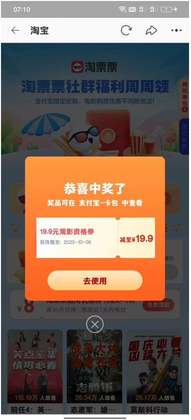 Tb一键领取19.9观影券1年前发布0399 活动介绍 扫码领取即可,无邀请性质。 © 版权声明本站提供的一切软件、教程和内容信息仅限用于学习和研究目的;不得将上述内容用于商业或者非法用途, 否则,一切后果请用户自负。本站信息来自网络,版权争议与本站无关。您必须在下载后的24个小时之内 ,从您的电脑或手机中彻底删除上述内容。THE END其他活动活动资讯 喜欢就支持一下吧点赞9 分享QQ空间微博QQ好友海报分享复制链接收藏